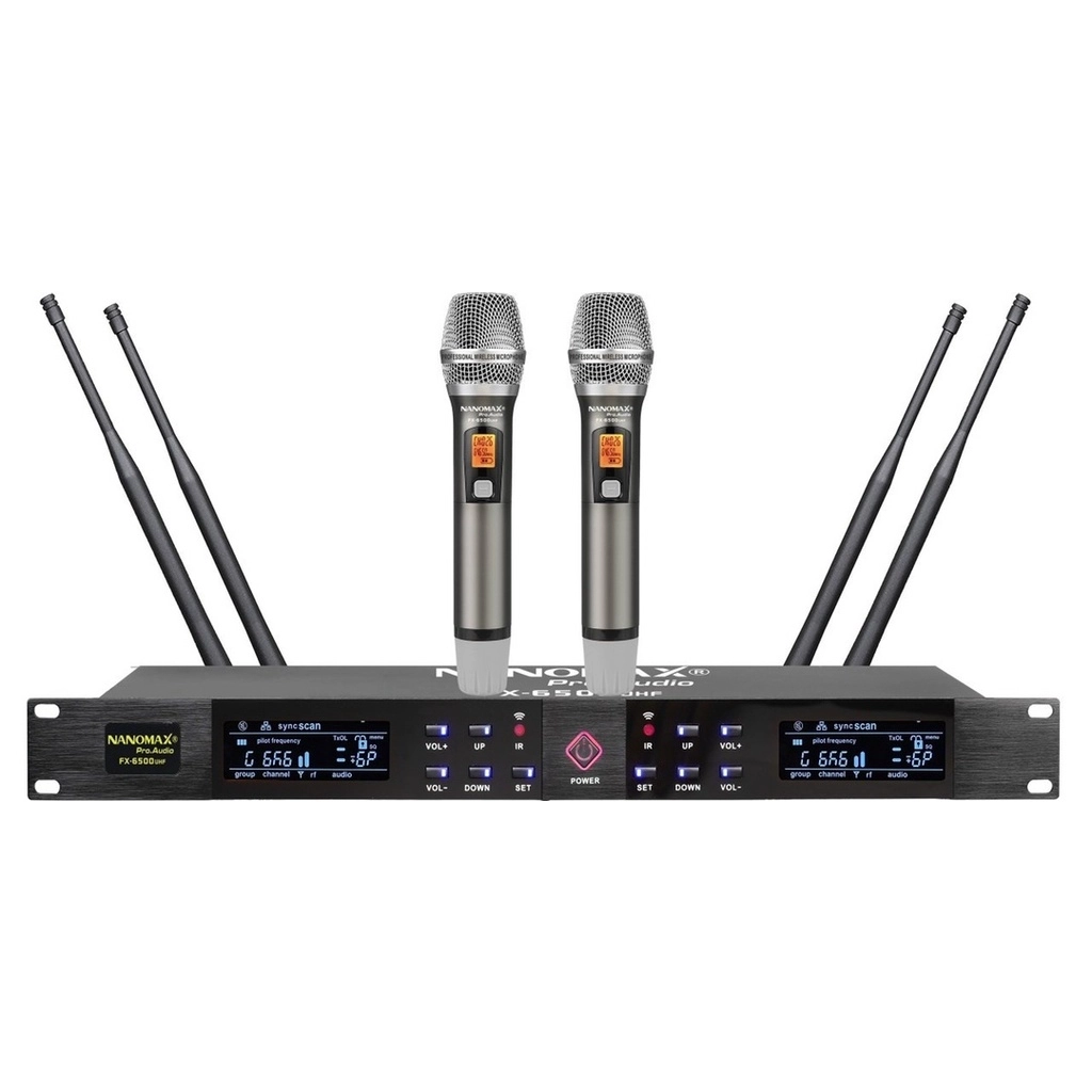 Micro Fx-6500 UHF cao cấp, Hành chính hãng công ty Sơn Tùng sản xuất và bảo hành. Sản phẩm mới nhất và cao cấp nhất của Nanomax với các tính năng như sóng cực khỏe, ổn định,... – Khoảng cách hoạt động tối đa 120m (ổn định thực tế 50m). – Micro không dây khác khi gặp vật cản sẽ làm sóng bị gián đoạn, khiến hát bị hụt hoặc ngắt quãng. Nhưng với FX6500 UHF thì hoàn toàn không bị làm khó. FX6500 không bị ảnh hưởng Chính điểm mạnh này, Nanomax FX6500 UHF được sử dụng tại những không gian lớn như hội trường. nhà thờ, nhà hàng,… Trong Karaoke, FX6500 UHF thể hiện được sức mạnh về sóng trong không gian phòng rộng hoặc phức tạp như nhiều đồ vật trong nhà, phòng không được vuông vắn. – Chất âm của FX6500 UHF cực kỳ chính xác. – Cả 3 dải âm của mic được thể hiện rõ nét – Mic hát rất nhẹ, tròn và chi tiết. – Loại bỏ tạp âm rất tốt hạn chế hiện tượng xé tiếng. – Tích hợp cảm biến để kích hoạt chế độ tự ngắt sau 3 giây không dùng – Chế độ quản lý pin cực kỳ hiệu quả. Thông số : Dải tần lựa chọn: 640 – 690MHz Chế độ điều chỉnh: FM Tần số đáp ứng: 60Hz – 18KHz Số lượng kênh điều chỉnh: 200 kênh Độ nhạy: -100dBm Khoảng cách hoạt động ổn định: tối đa 120 mét (tốt nhất trong 50-60m). THD: <0.5% (@1KHz) Tỷ số S / N> 105dB Nguồn điện: DC 12-16V , 1200mA Màn hình: LCD nền đen + màn hình backlit nhiều màu Trọng lượng: 3kg Tùy chọn màu: Đen Bảo hành: 12 tháng 👉 Với thiết kế đặc biệt, đẹp mắt, tích hợp nhiều tính năng,đây sẽ là lựa chọn hoàn hảo dành cho các hệ thống âm thanh chuyên nghiệp của bạn như âm thanh Karaoke, âm thanh hội trường, dàn nhạc sống đám cưới… Dùng trong các buổi diễn thuyết, hội thảo hay trong các sân khấu lớn,Ứng dụng dùng trong các hội trường , các phòng lớn và nhà thờ... Đầu thu chất lượng cao công nghệ tiên tiến của nước ngoài cho âm thanh tốt, trong, ấm. Micro thuộc dòng micro không dây tần số cao UHF với khả năng thu phát sóng ổn định trên dải tần 700-900 MHz. Được làm bằng thép không gỉ, độ bền cơ học cao. Được trang bị đầu thu âm chất lượng cao giúp tái tạo giọng hát trung thực và truyền cảm với người sử dụng... Tính năng set up tần số sóng tránh tình trạng trùng lặp.. Cảm ứng tắt micro khi không sử dụng giúp bảo vệ micro và tiết kiệm pin...