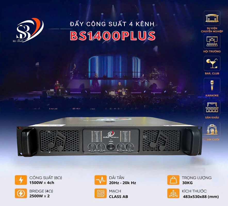 Cục đẩy công suất BS 1400PLUS là trợ thủ đắc lực của một dàn karaoke chuyên nghiệp, cho âm thanh phát ra luôn tròn đầy, chắc nhưng vẫn rất truyền cảm. BS 1400PLUS là mẫu cục đẩy công suất 4 kênh có mức công suất 1400W/ 1 CH ở chế độ 8Ω Stereo power, thuộc dòng TD-series của hãng BS.
