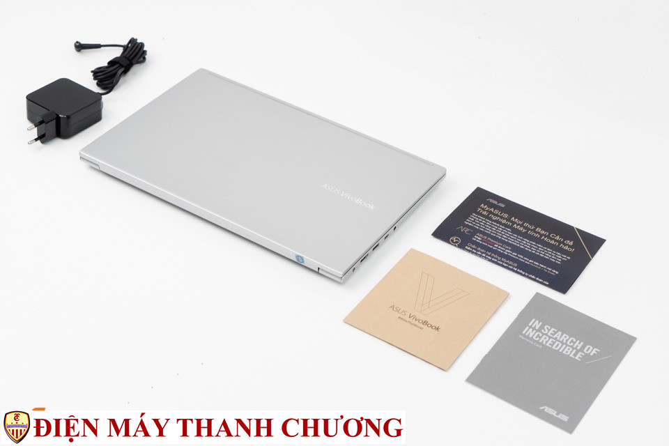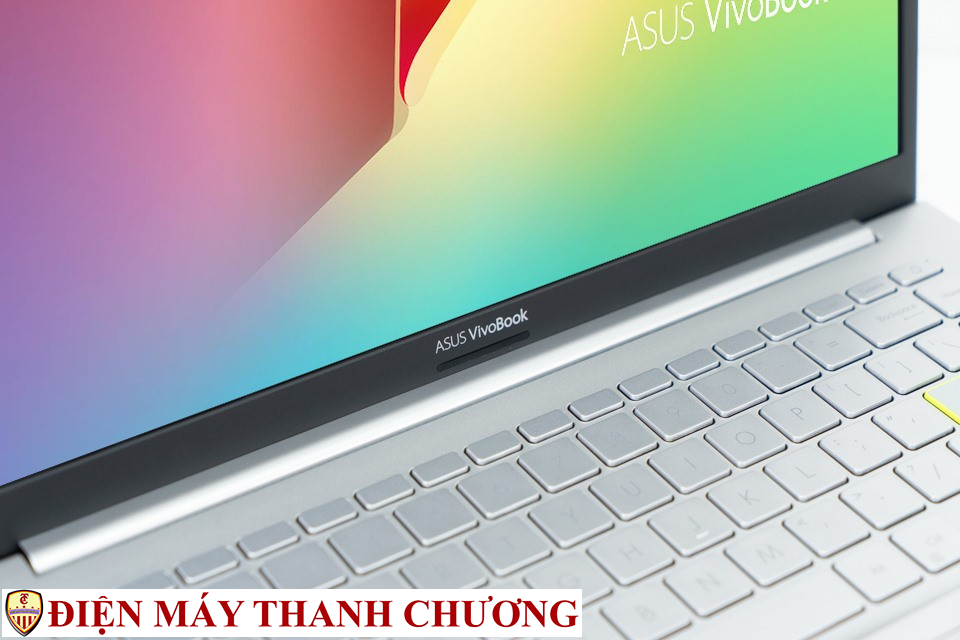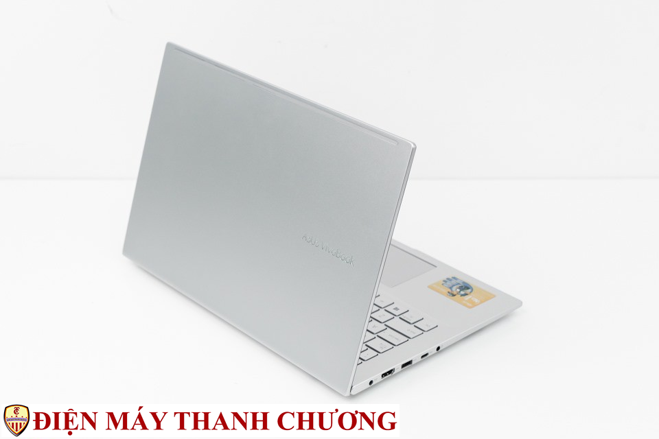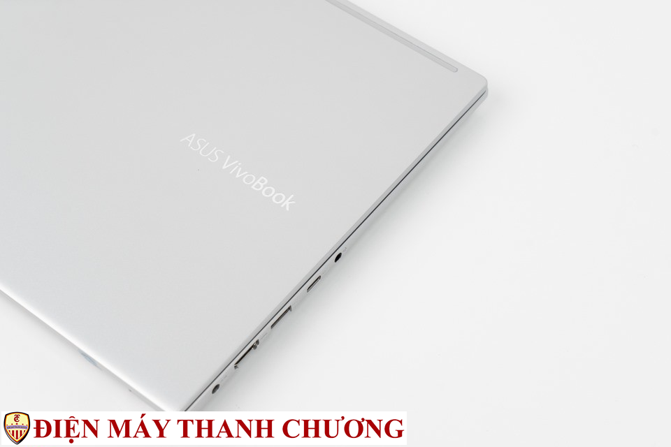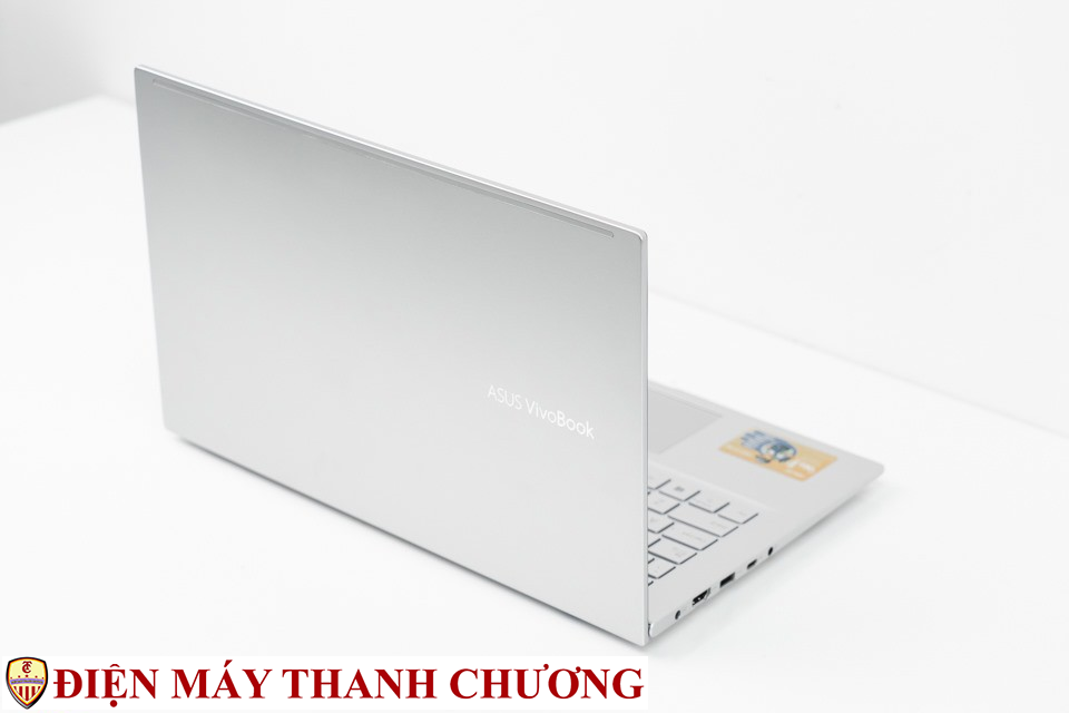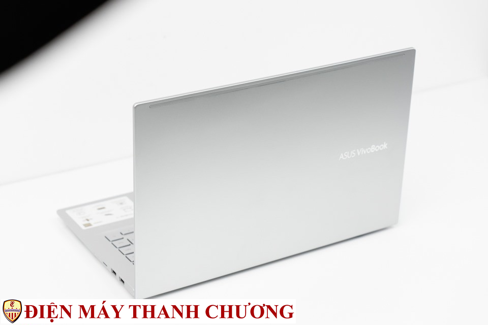 VivoBook A415 có màu bạc sáng năng động ở thân máy, nắp lưng màn hình lẫn bàn phím. Viền màn hình NanoEdge hai bên rất mỏng theo xu hướng chung của các dòng laptop thế hệ mới hiện nay. Viền cạnh trên, dưới màn hình cũng khá mỏng và đều nhau nên kích thước tổng thể của VivoBook A415EA vô cùng gọn gàng, chỉ lớn hơn cuốn sách chút ít. Nắp lưng chất liệu kim loại chắc chắn và có tính thẩm mỹ cao với logo VivoBook đặt hẳn sang bên phải.